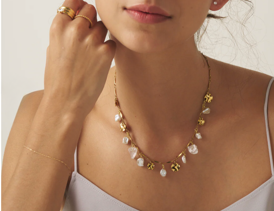 華奢なネックレスやリングは、主張しすぎず、